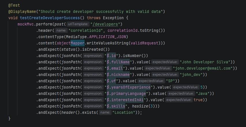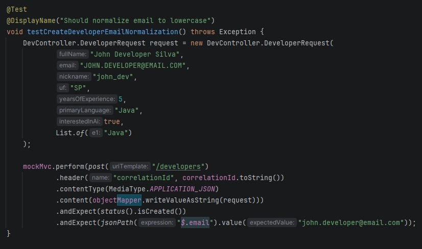 @Test @DisplayName("Deve normalizar email para lowercase e fullName para title case") void deveNormalizarCamposQuandoCriarDeveloper() throws Exception { String payloadComCaseMixto = """ { "fullName": "JOAO CARLOS SILVA", "email": "JOAO@EXAMPLE.COM", "nickname": "joao.dev", "uf": "mg", "yearsOfExperience": 2, "primaryLanguage": "JAVA", "interestedInAi": false, "skills": ["spring boot"] } """; mockMvc.perform(post("/developers") .header("correlationId", CORRELATION_ID) .contentType(MediaType.APPLICATION_JSON) .content(payloadComCaseMixto)) .andExpect(status().isCreated()) .andExpect(jsonPath("$.email").value("joao@example.com")) .andExpect(jsonPath("$.fullName").value("Joao Carlos Silva")) .andExpect(jsonPath("$.uf").value("MG")) .andExpect(jsonPath("$.primaryLanguage").value("Java")); }