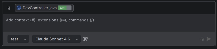 Após colar o conteúdo, deixe a classe DevController.java aberta, abra a barra lateral do GitHub Copilot, selecione o nosso novo agente test e altere o modelo para Claude Sonnet 4.6. Entenda: o agente é um especialista em um assunto, mas sua fundação, seu “conhecimento de mundo”, é o modelo. A combinação certa traz os melhores resultados.